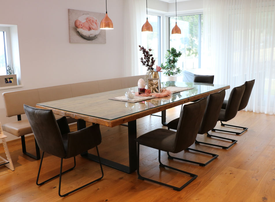 Zwei parallel gestellte Sitzbänke an der Längsseite des Tischs sind da nur eine von vielen Möglichkeiten, wie moderne Essbereiche gestaltet sein können. Die einen schwören auf die klassische Eckbank wie zu Omas Zeiten (nur in modern), die anderen wollen nichts als Stühle rings um den Tisch.