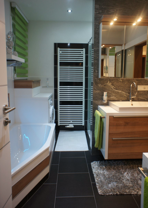 Zu den Fotos: Bei Badezimmern gibt es für uns keine klassische „Stilrichtung“ – nur eine persönliche. Darum zeigen wir hier auch ein kunterbuntes Potpourri von Kundenprojekten.